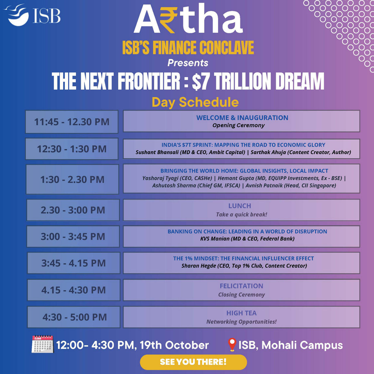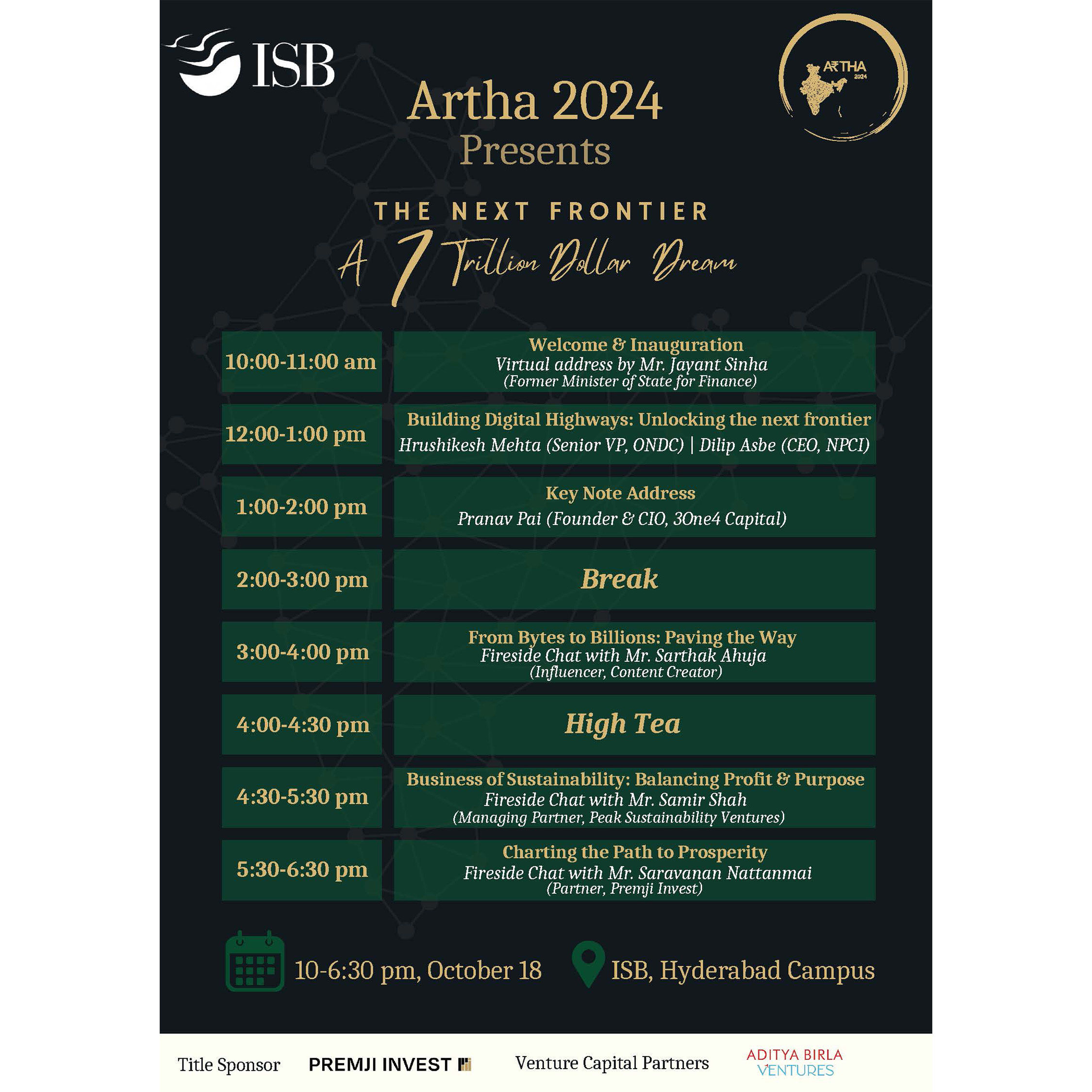 It is with great enthusiasm and deep conviction that we invite you to Artha'24, ISB’s flagship finance festival. This year, under the banner of "The Next Frontier: The $7 Trillion Dream," we gather to confront a moment of extraordinary significance in India’s story. The aspiration to transform India into a $7 trillion economy is not merely an economic goal—it is a call to action for all of us who envision a brighter future for this nation. At Artha, we will engage in thoughtful discourse on the sectors that will shape that future: fintech, a force for democratizing financial opportunity; infrastructure, the bedrock of progress; and digital transformation, unlocking boundless potential for innovation. These are not just drivers of growth—they are catalysts for the promise that India holds. And in this defining moment, your voice is needed. Your insights, shaped by experience and vision, can help guide this conversation, inspiring others to see beyond numbers to the greater promise of what can be achieved. The future we seek is one of possibility, of innovation, and of opportunity for all. “Growing prosperity augurs well for national progress. Undoubtedly, we are standing at the cusp of a new era of economic prosperity and are on course towards fulfilling our dream 'Viksit Bharat' by 2047".